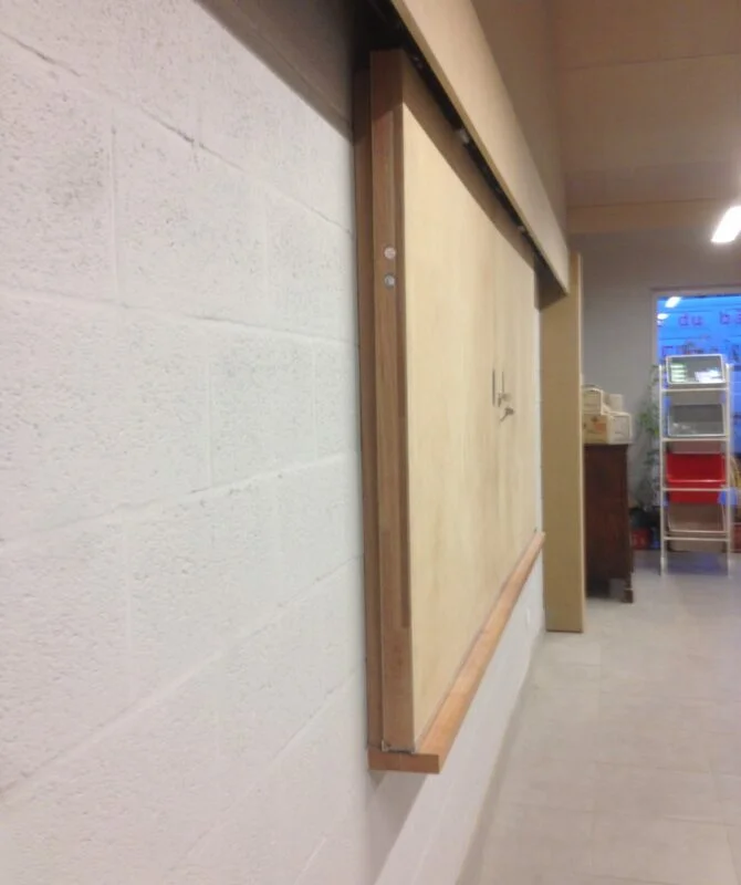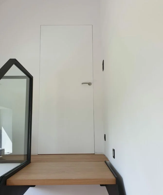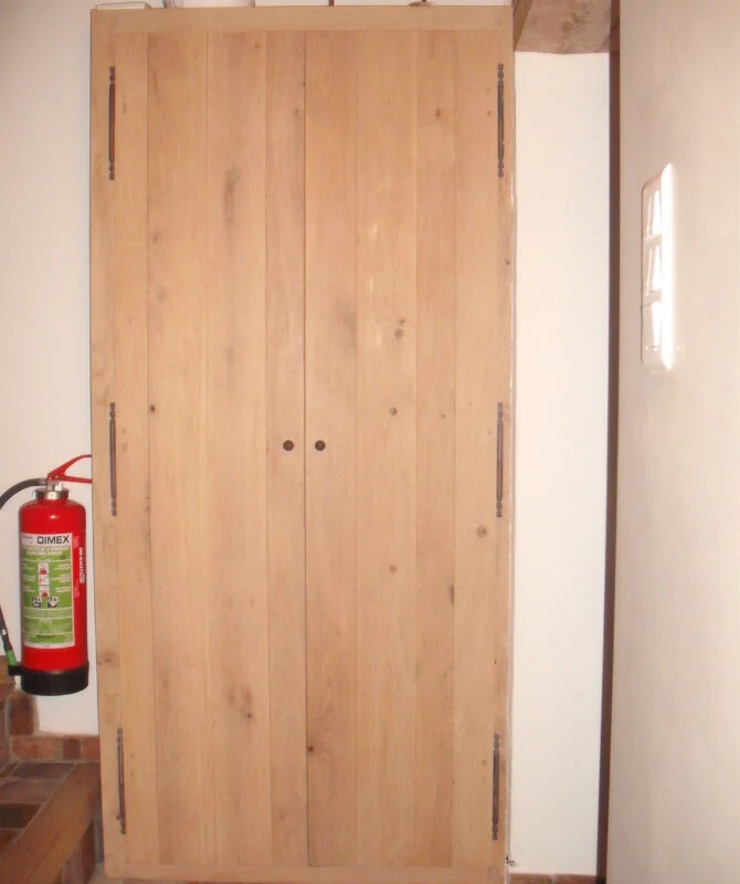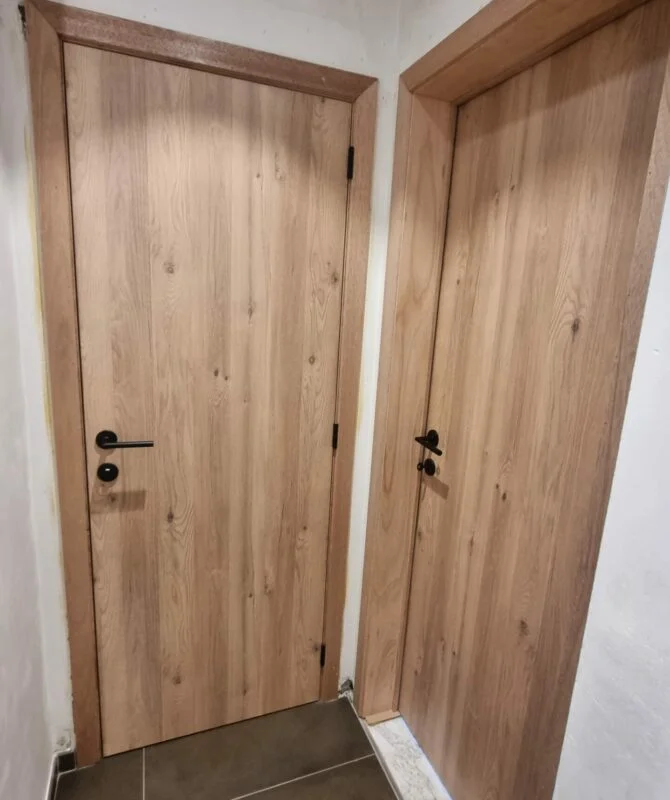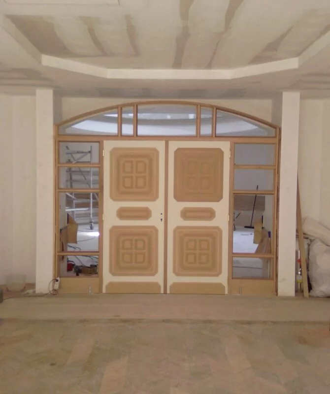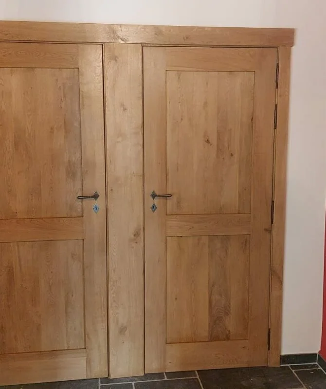 La dernière étape est la mise en place des portes. Nous posons les encadrements, charnières et évidemment la porte en elle-même. L’installation est minutieuse et précise.
