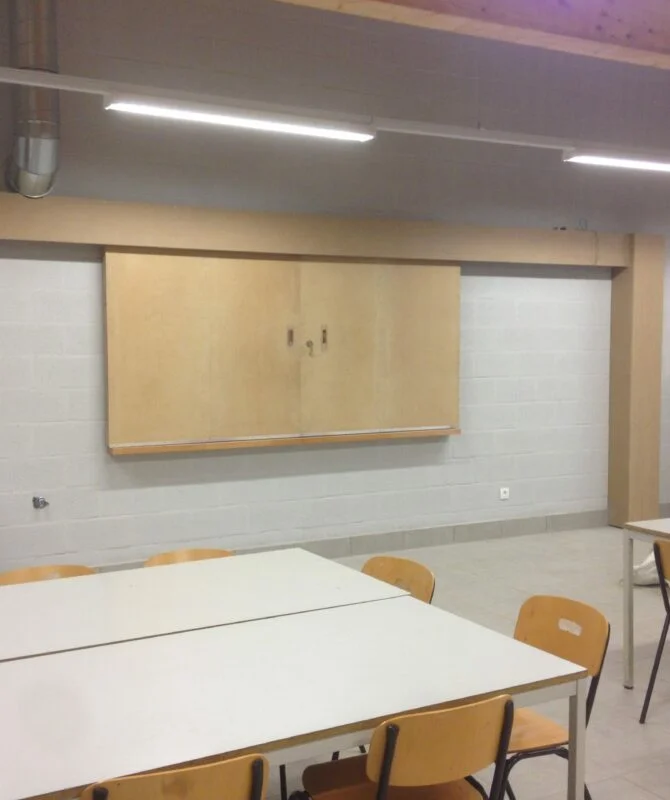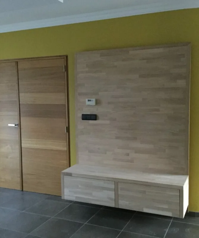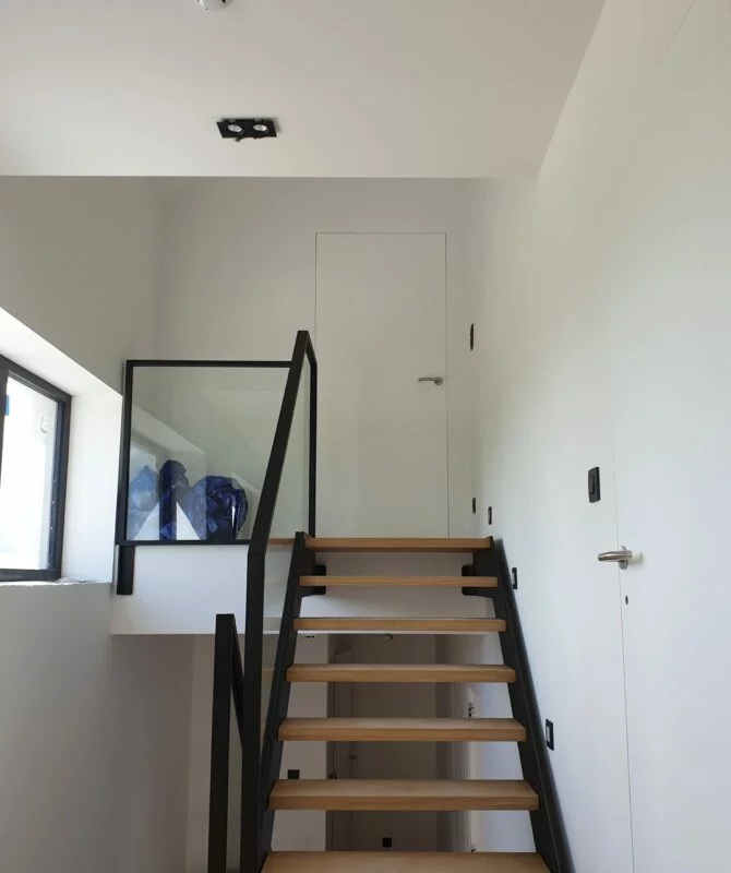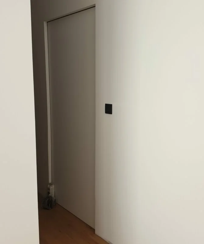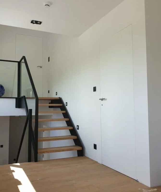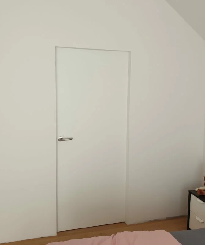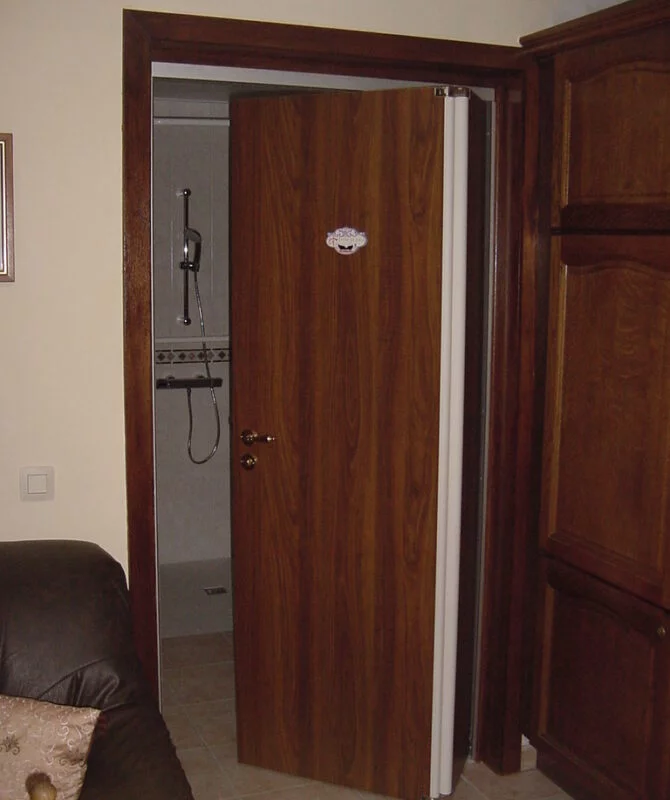 La dernière étape est la mise en place des portes. Nous posons les encadrements, charnières et évidemment la porte en elle-même. L’installation est minutieuse et précise.